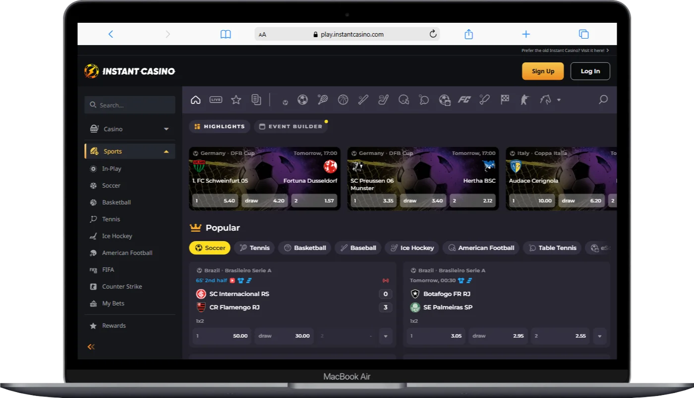 تقدّم Instant Casino منصة مراهنات حديثة تركز على السرعة وسهولة التعامل، مع اعتماد شبه كامل على العملات الرقمية في عمليات الإيداع والسحب. المنصة ليست مخصّصة فقط للكازينو، بل تحتوي على قسم مراهنات رياضية متكامل يشمل الرياضات التقليدية والرياضات الإلكترونية، مما يجعلها خيارًا مناسبًا للمستخدم الذي يبحث عن موقع يجمع أكثر من نوع مراهنة في مكان واحد.
