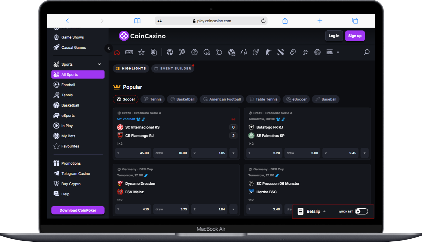 تقدّم CoinCasino منصة مراهنات رقمية تجمع بين الكازينو التقليدي وأسواق المراهنات الرياضية مع تركيز واضح على الرياضات الإلكترونية. تعتمد المنصة على نظام دفع مبني على العملات المشفرة، مما يمنح المستخدم سرعة في الإيداع والسحب ويقلّل من القيود المرتبطة بالطرق البنكية التقليدية. كما تقوم المنصة بعرض مجموعة واسعة من الألعاب الإلكترونية الشائعة ضمن بطولات رسمية ومباريات مباشرة، مما يتيح للمستخدم فرصة متابعة المباراة والرهان عليها ضمن الوقت الفعلي.