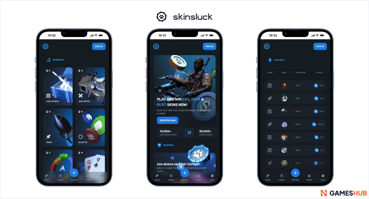 Skin-Specific Bonus | Skin sites sweeten inventory-based play with matched deposits or daily cases. Skinsluck promotes a 50% first-deposit bonus plus a Free Daily Case. |
