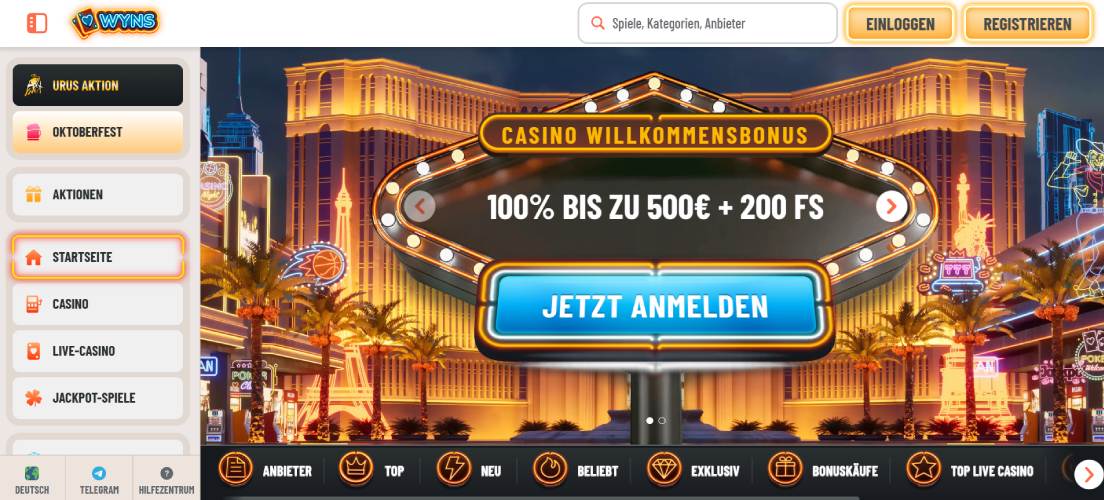 Neue Kunden beginnen bei Wyns mit einem fairen 100 % bis 500 € Willkommensbonus sowie 200 Freispiele. Einen Extrapluspunkt gibt es im Test für die sehr, sehr gute Gestaltung der Webseite. Das Casino Portal ist optisch ansprechend und glänzt mit einer selbsterklärend Menüführung.
