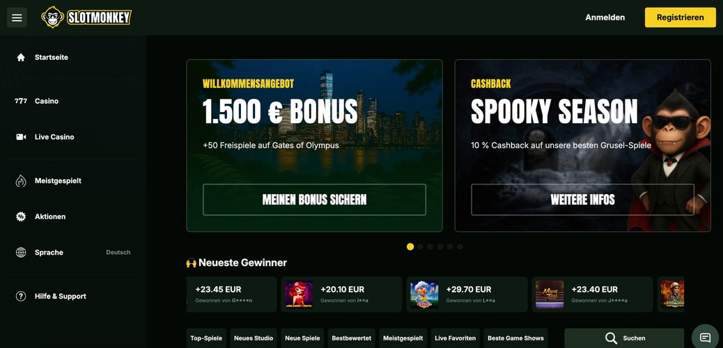 Slotmonkey Casino gehört zu den Casinos ohne OASIS und richtet sich gezielt an Bonus Jäger, Krypto Spieler und High Roller. Der Willkommensbonus bis CHF 1500 und 50 Freispiele attraktiv. Über 5.000 Spiele von allen den besten Software Anbietern wie Pragmatic Play stehen bereit, inklusive Crash Games wie Aviator und Live Dealer Spiele wie Crazy Time.