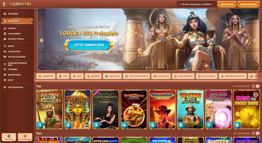 Cleobetra kombiniert stilvolles Design mit einem 100 % Willkommensbonus bis zu CHF 1.000 und 350 Freispielen bei fairen 35x Umsatzbedingungen. Wöchentliche Reload Boni und VIP Cashback bis zu 15 % mit 1x Umsatzbedingungen ergänzen das Angebot. Dazu gibt es auch mehr als 5.000 Spiele mit eigenen Live Casino, Sportwetten und Rubbellose Bereichen.