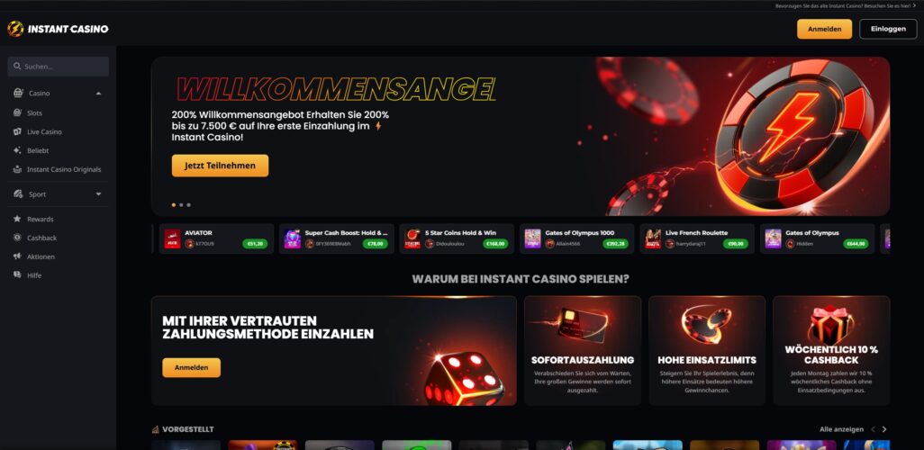 Instant Casino gehört zu den Casinos ohne OASIS und richtet sich gezielt an Bonus Jäger, Krypto Spieler und High Roller. Der Willkommensbonus ist mit 200 % bis zu CHF 7.500 extrem attraktiv, ergänzt durch einen 10 % Cashback ohne Umsatzbedingungen bei Verlusten bis zu CHF 10.000. Über 5.000 Spiele von allen den besten Software Anbietern wie Pragmatic Play stehen bereit, inklusive Crash Games wie Aviator und Live Dealer Spiele wie Crazy Time.
