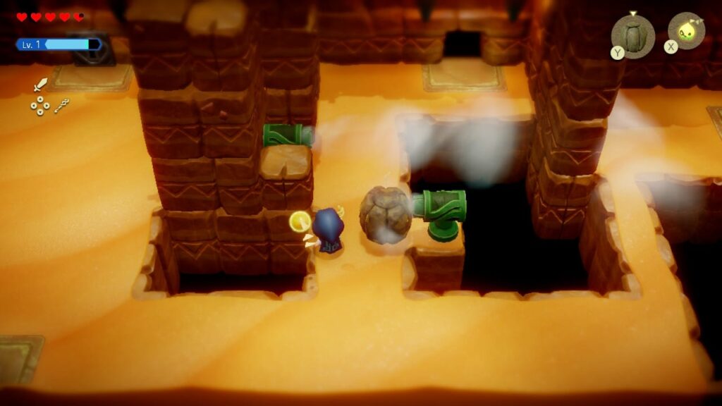 Viele der Herausforderungen in Echoes of Wisdom erfordern ein zusätzliches Maß an Überlegung, da man die Umgebung nach seinen Wünschen manipulieren muss. Würde ein vor einer Windmaschine platzierter Stein verhindern, dass man weggeweht wird? Was ist mit einem größeren Stein? Was wäre, wenn man sich an den Stein bindet und dieser den eigenen Bewegungen folgt? Wie weit kann man kommen?