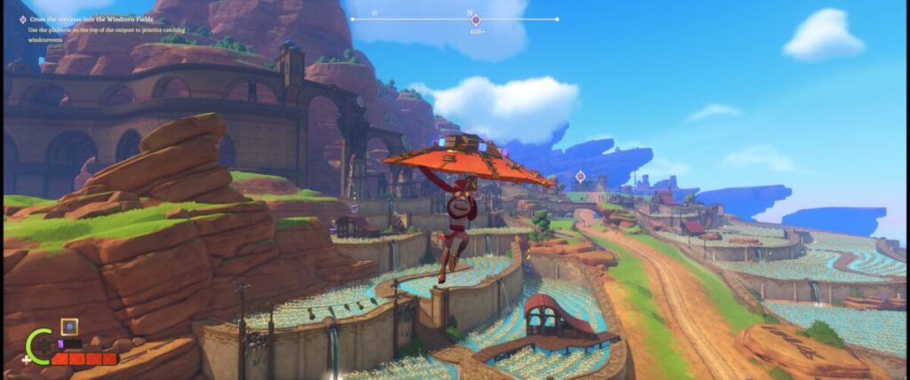 Es macht einfach immer Spaß, einen Hügel hinunterzusausen, auf einen hüpfenden Pilz zu springen, sich auf einen Felsen zu begeben und dann mit dem freischaltbaren Schwebemodus direkt zum Questgeber zu segeln. Ähnlich wie beim Durchqueren der Welt im unterhaltsamsten Teil des ebenfalls neu erschienenen „Sword of the Sea” wünschte ich mir aufgrund der allgemeinen Bewegungsabläufe im Spiel, dass es etwas weniger Open World und mehr Plattformspiel wäre.