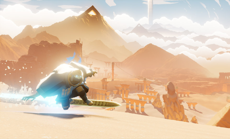 Der Kern des Spiels ist das „Hoversword“, dessen Steuerung sich absolut unglaublich anfühlt. Es ist eine perfekte Mischung aus Snowboard, Skateboard und Surfbrett, die das Fortbewegen zu einem absoluten Vergnügen macht. Die Steuerung ist flüssig, intuitiv und nachsichtig und so konzipiert, dass sie Sie nicht bestraft, sondern Ihnen ein Gefühl von Anmut und Kraft vermittelt, wenn Sie durch Sanddünen carven und sich in die Luft schwingen.
