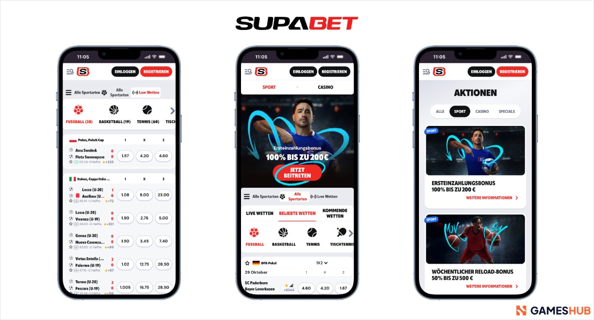 Supabet bietet einen 200 € Willkommensbonus, Reload-Boni, einen Sport Cashback und hat auch Angebote für echte Wettprofis wie 2 Tore vorzeitige Auszahlung, Kombiwetten-Boosts oder erhöhte Quoten im Angebot.