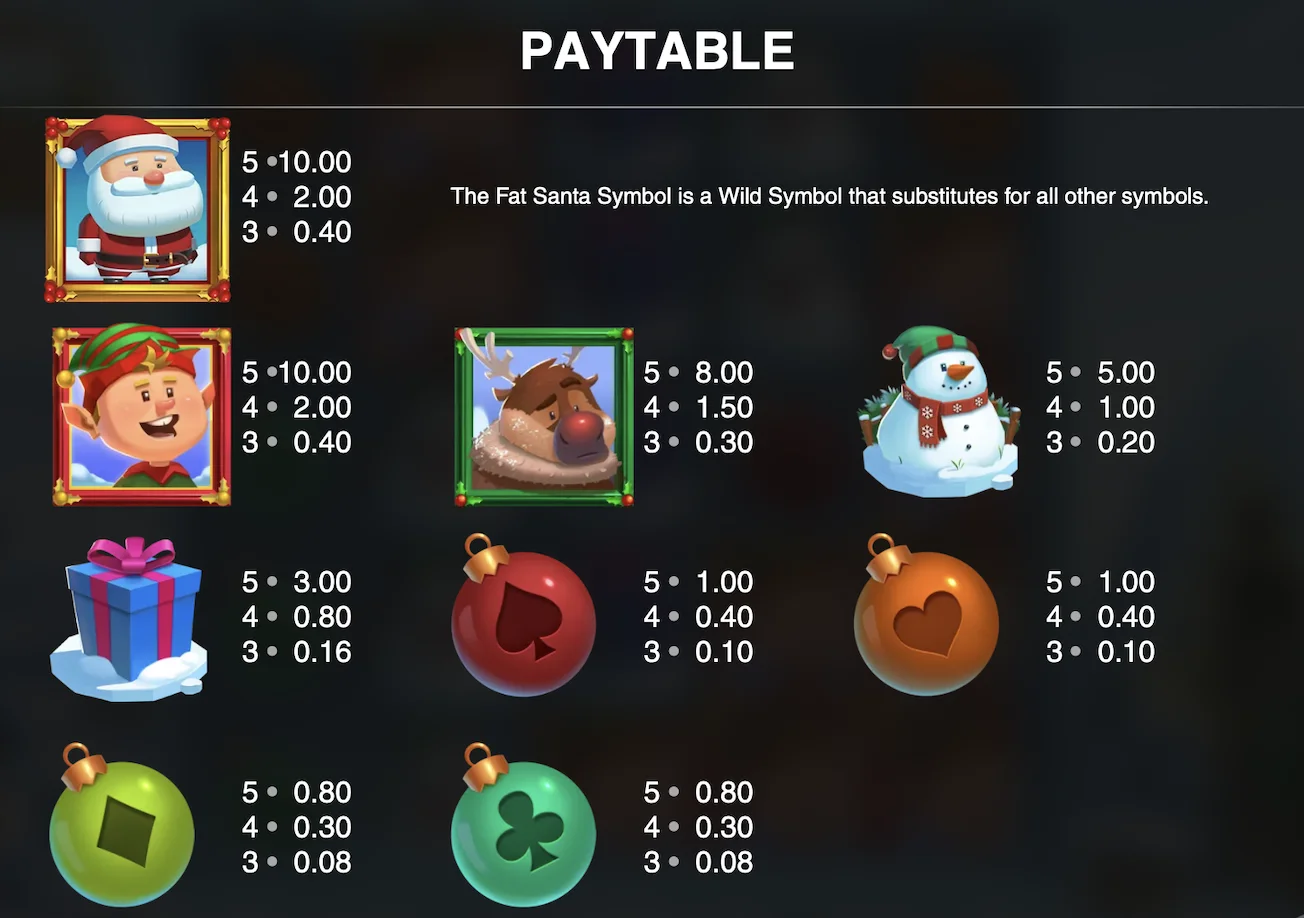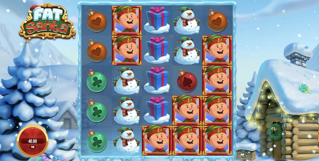 Fat Santa rakentuu 5 rullan ja 5 rivin ruudukkoon, jossa käytetään “Cluster Pays” -tyyppistä mekaniikkaa tavallisten voittolinjojen sijaan. Pelaajan tavoitteena on saada vierekkäisiä symbolikokonaisuuksia, jotka muodostavat voittoryppäitä. Santa toimii wildina ja ilmestyy silloin tällöin kelkallaan lisäten pelialueelle satunnaisen määrän piparkakkuja. Tämä ominaisuus voi aktivoitua milloin tahansa peruspelissä ja toimii erinomaisena mausteena bonusominaisuuden metsästyksessä.
