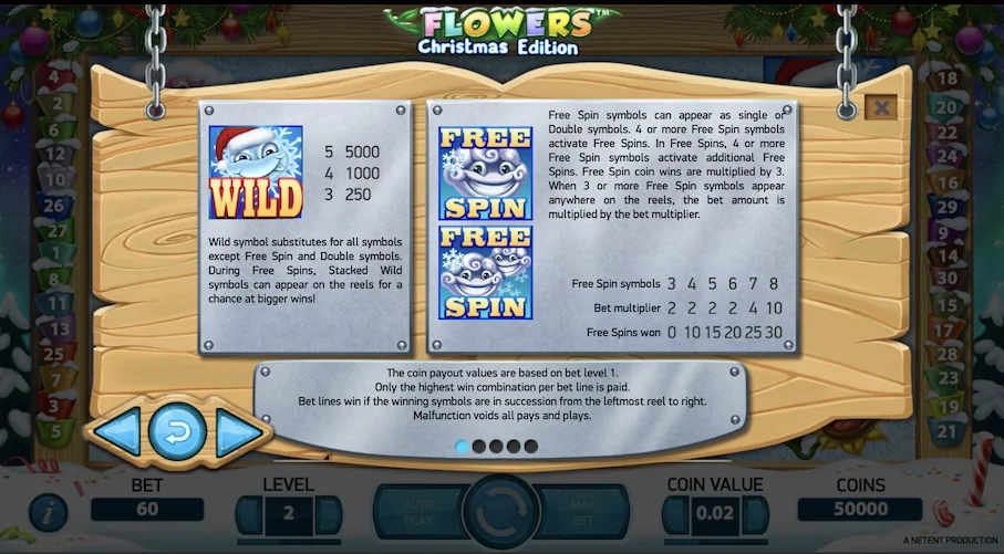 Voittotaulukko etenee loogisesti: perusymbolit antavat pienempiä voittoja, ja arvokkaammat symbolit mahdollistavat suuremmat osumat. Kiinteät voittolinjat tekevät taulukosta helppolukuisen ja pelaajalle ymmärrettävän kokonaisuuden. Tämä tekee Flowers Christmas Editionista erinomaista peruspeliä niille, jotka arvostavat selkeää ja stressitöntä pelikokemusta.