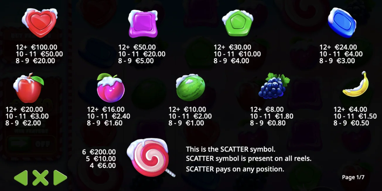 Symbolit ovat värikkäitä ja jouluisesti kuorrutettuja versioita alkuperäisen pelin symboleista. Pieniarvoisia symboleita ovat hedelmät, kuten banaanit, vesimelonit ja rypäleet, kun taas arvokkaampia ovat sydämen muotoiset ja neliönmuotoiset karkit. Scatter-symbolina toimii joulusävytteinen tikkari, ja ilmaiskierroksilla kerroinpommit ovat keskeisessä roolissa – ne voivat osua satunnaisesti ja kasvattaa kokonaista voittoriviä jopa järisyttävästi.