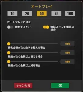 - オートプレイ停止条件:$0から始まり、最大$2,000~$20,000まで