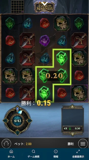 Tome of Madness にはペイラインがなく、5リールx5列のグリッド上で、同一のシンボルが4つ以上揃うと配当が成立する仕組み。