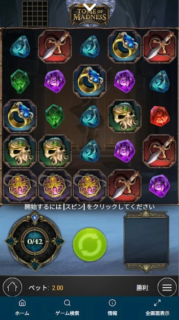 利用したいネットカジノの公式サイトにアクセスし、ゲーム検索ページを開きます。スロットカテゴリーから探すこともできますが、検索機能を使えばピンポイントでマッドネスをTome of Madnessを探せて便利です。