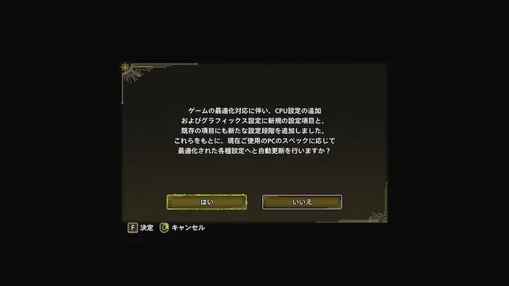 肝心のゲーム起動についてだが、筆者の環境ではアップデートが重なる度にどんどんとタイトル画面のフレームレートが落ち、カクカクという表現では済まないレベルにまで不安定な状態が続いていた。このパッチを適用後のタイトル画面はというと、一瞬だけカクつきが見られたものの、その後は一切フレームレートの大幅な低下が見られない。なんと数カ月ぶりにタイトル画面での表示が安定しているのだ。