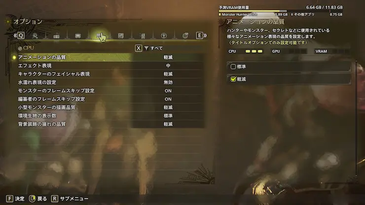 そのカラクリは恐らく今回実装された「CPU」に関する設定項目だ。例えばグラフィックボードはRTX 3060 12GBであっても、同世代のCPUでは、現行最高峰のCPUと比較してスペックはかなり劣る部類に入る。そのため元々のCPU負荷が軽量化されない限り、モンスターハンターワイルズの動作の安定性は保証されていなかったのだ。CPU周りの処理負荷を調整するメニューは以下のスクリーンショットのとおりだ。