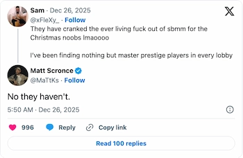 12月26日、プレイヤー@xFleXy_はXでこう不満を漏らした。「クリスマスの初心者のために、SBMMをめちゃくちゃに強化しすぎだよ。どのロビーにもマスタープレステージプレイヤーしかいないし」。するとTreyarchのデザインディレクター、マット・スクロンスが「いや、強化してないよ」と返答した。