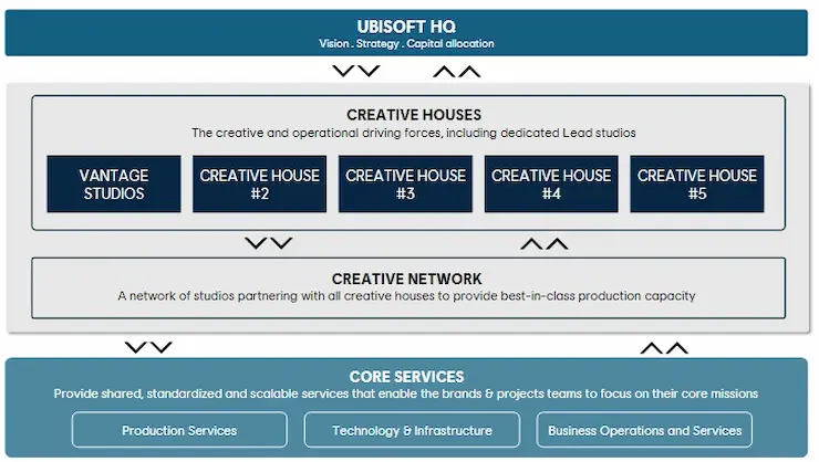 組織再編で注目されるのが、同社の制作体制の刷新だ。これまで多くのスタジオを抱え、それぞれのスタジオ同士が連携し合う事で大規模タイトルの製作を行っていた同社。今回同社が語ったのは「制作と出版を統合した事業部門であるクリエイティブハウス」というシステムだ。プレスリリースによれば「各クリエイティブハウスは明確なジャンルとブランドを軸に構築され、専任のリーダーシップチームが統括する完全な責任体制と財務的自律性を備えています」との事である。これまでスタジオを横断する形でタイトルを開発していたが、今後は「タイトル毎に必要な人材が割り当てられる」というタイトル主導型の開発体制へとシフトしていくようだ。今回発表された構造は下図の通り。