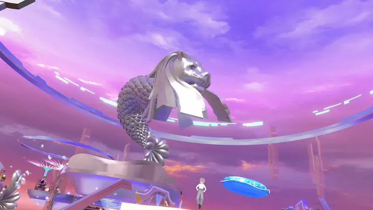 一方でパラリアルシンガポールは合計3エリアと非常に控えめな構成だ。これまでの企業展示の中で、パラリアル化して以降最小かと思える移動可能面積だ。だがしかし世界最高峰の統合型リゾート施設「マリーナベイ・サンズ」をモチーフとした遠景やいたるところに見えるマーライオンをモデルとした景観、全体を通して水の透明感を重視してデザインされたワールドは、出展企業の高級感を後押ししている。