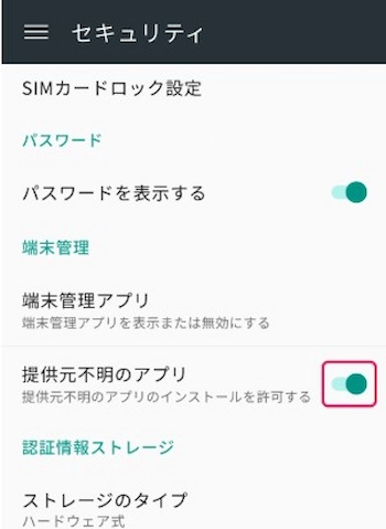 セキュリティ設定から「提供元不明のアプリ」を許可し、インストールを可能にする必要があります。