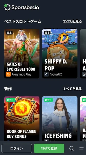 カジノセクションでは、スロットやライブカジノなどの定番人気タイトルをはじめ、豊富なジャンルがバランスよく並びます。日本円や仮想通貨に対応し、入出金の操作はスムーズでストレスを感じさせません。また、アプリ起動時にすぐ残高が表示されるため、資金状況の把握も簡単です。
