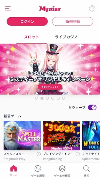 遊べるゲームジャンル | スロット、テーブルゲーム、ライブカジノ、オリジナルゲーム 等 |