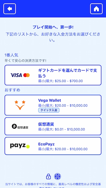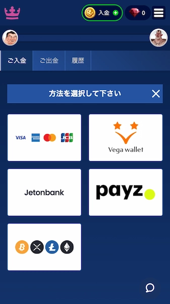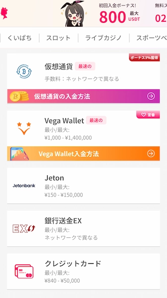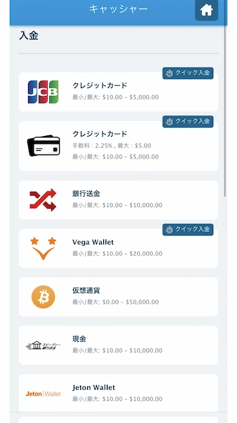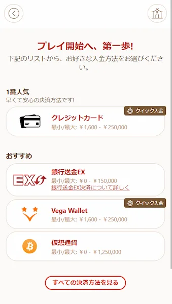 クレジットカードは基本的に入金専用であり、出金には利用できません。そのため、銀行送金、ベガウォレットなどの電子決済、仮想通貨といった出金用の手段を用意しておく必要があります。
