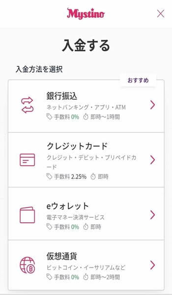 ミスティーノは、クレジットカード入金に Visa/Mastercard/JCB/Amex が対応。入金額は最小1,500円〜最大35万円で、即時反映されます。 通貨は日本円・USDに対応しており、日本円での入金なら為替手数料がかからず利用可能です。外貨カード利用時にはカード会社レートに基づく為替手数料(2〜3%程度)が発生します。入金手数料は2.25%に設定されています。 カード入金分はカードへ出金できず、銀行送金が基本となります。電子決済や仮想通貨で出金したい場合は、過去にその方法での入金履歴が必要です。日本語サポートも利用可能で、安心してプレイできます。