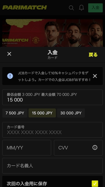 パリマッチは、日本市場向けに日本円アカウントを提供しているオンラインカジノで、利便性とセキュリティに強みがあります。クレジットカードは Visa/Mastercard/JCB に対応しており、特に JCBカード利用で10%キャッシュバックが受けられる特典が魅力です。 入金額は最小3,000円〜最大7万円までと幅広く、数分から数時間で反映されます。サイト通貨は日本円と米ドルの両方に対応しており、日本円アカウントを選べば為替換算の手間やコストを回避できます。 入金手数料は無料で、発行銀行によって個別手数料が発生する場合があるものの、パリマッチ側では請求されません。さらに日本語サポートも完備しており、国内ユーザーにとって安心して利用できる環境が整っています。