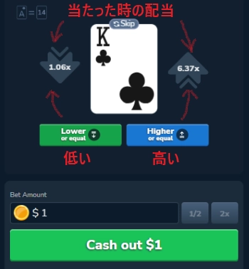 - 次のカードが現在のカードランクより高いか、または低いかどちらかを選択する