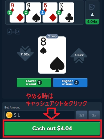「スキップ」は何回でも使え、追加料金なども一切なし。あまり大きく差のあるカードに交換できることは少ないですが、9 → 8 → 7 → 3 といったこともあります。最小ベットは$1からですが、RTPも高くコツコツと増やしやすいハイアンドロ―ゲームです。
