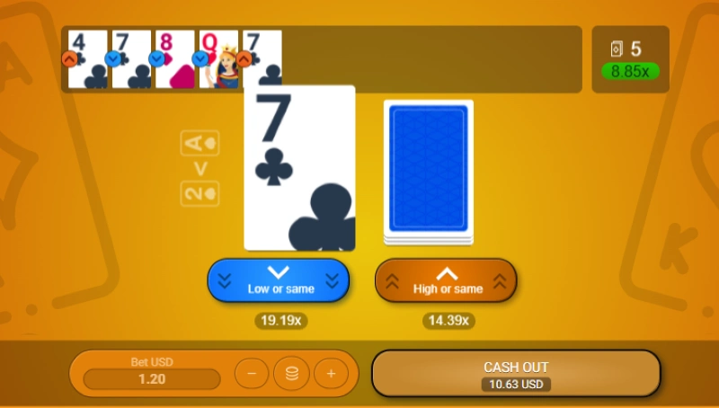 Spribe社のHiLoは、明るく見やすいデザインが魅力。賭け方はハイもしくはローのみの、シンプルな仕組みとなっています。