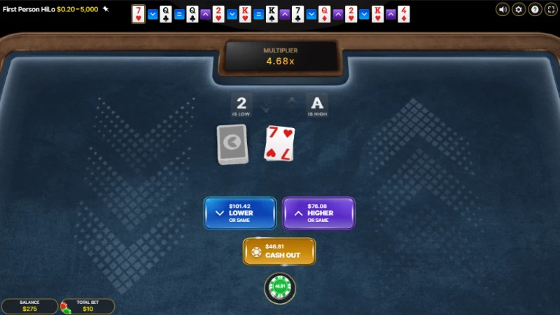 Evolution社のファーストパーソン HiLoでは純粋なハイローゲームが楽しめます。このゲームではちょっとしたカジノの雰囲気が味わえ、賭け方は「ハイ」か「ロー」のみなので軽快にプレイ可能。