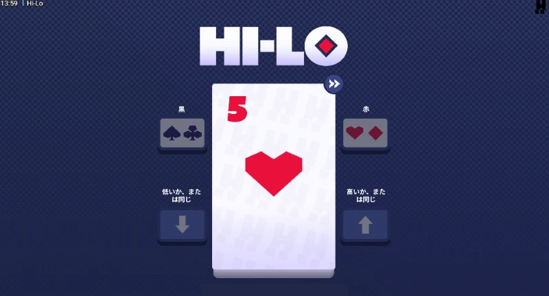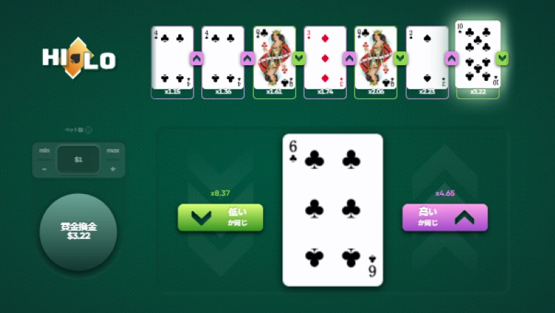 ハイアンドロ―(HiLo)とは、表示されたカードより次のカードのランクが低いか高いかを予想して賭けるオンラインカジノ ゲームの一種です。ルールは至って単純で初心者もテンポよくプレイ可能。