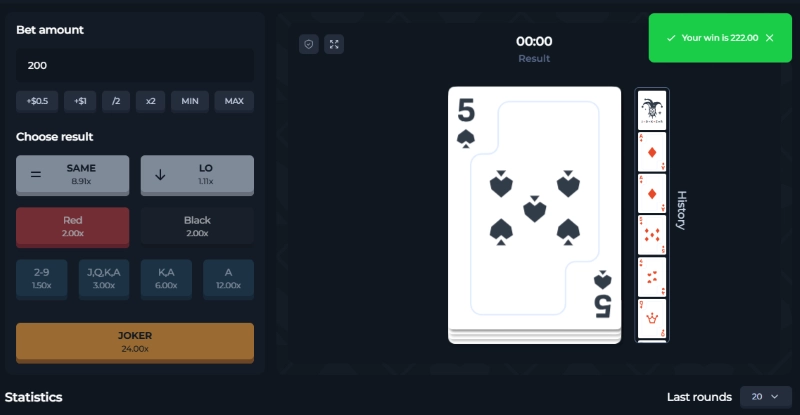 ジョーカーは、ルーレットでいう「0」の様な役目を果たします。例えば、3からハイにベットし、ジョーカーが現れると負け。しかし、ジョーカーの次のカードは、ジョーカーが再び出ない限り勝ちが約束されたようなもの。