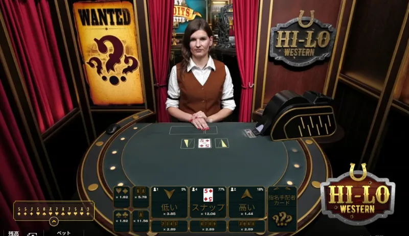 Playtech社の「ハイローウエスタン」では、ライブカジノ形式のハイアンドローゲームに参加可能。6デッキのカードが使われており、各デッキの「10」は除かれています。