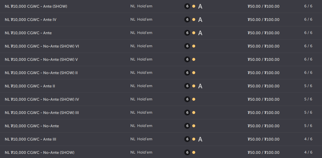 To make the event more interesting for railbirds, some tables also automatically show the winning players’ cards at showdown, and players must sit at one or more of those show tables. Many of the tables also have antes to encourage action. Read more about the mechanics of the CGWC promotion on the CoinPoker website.
