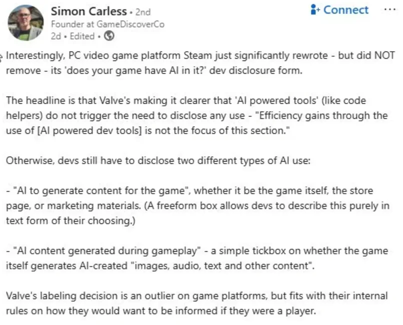 The change, spotted by GameDiscoverCo’s Simon Carless on LinkedIn, refines the AI section of Steam’s submission form: “efficiency gains” from behind-the-scenes AI aren’t flagged.