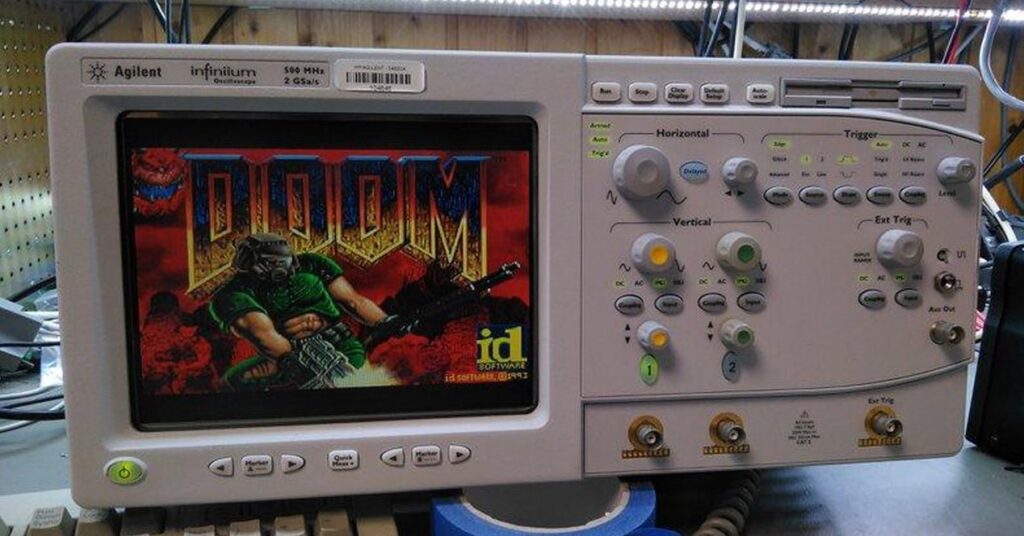 Em laboratório, o Doom foi transformado em visualização para os modos ‘XY’ de um osciloscópio: os traços que normalmente medem sinais viram gráficos e inimigos do jogo.