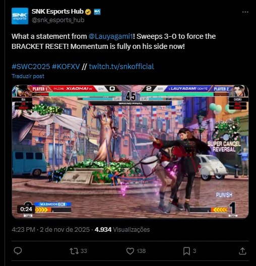 No momento decisivo, LauYagami manteve a calma, aplicou combos perfeitos e selou o confronto com um emocionante 3 a 2, conquistando o primeiro título mundial de The King of Fighters XV para o Brasil.