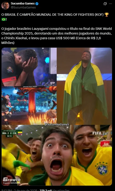 ‘Jogo KOF desde criança. Sempre sonhei em representar o Brasil e mostrar que temos nível mundial. Hoje esse sonho virou realidade’, declarou emocionado.