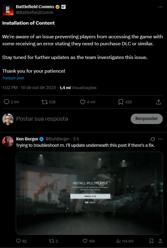 Apesar da euforia, parte dos jogadores enfrentou falhas de instalação, com mensagens de erro relacionadas a conteúdos adicionais (DLCs).