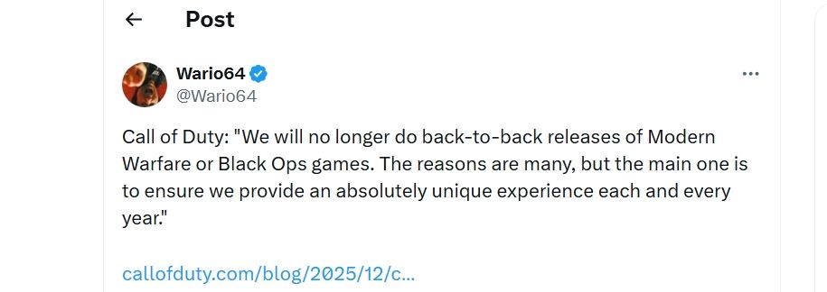 Então isso mudou. MW2 (2022) → MW3 (2023). Avançando: Black Ops 6 (outubro de 2024) → Black Ops 7 (14 de novembro de 2025).