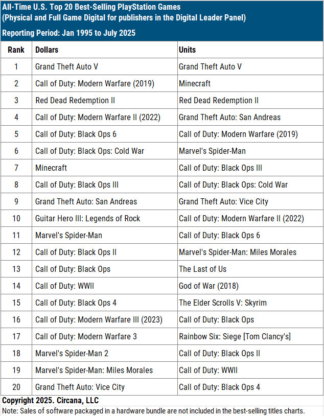 O analista Mat Piscatella, diretor-executivo da Circana, divulgou em setembro a lista dos jogos mais vendidos nas plataformas PlayStation nos Estados Unidos entre janeiro de 1995 e julho de 2025.