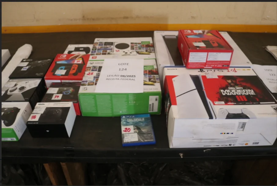 Outro destaque para os gamers é o lote 124, que reúne uma variedade de videogames e controles das principais marcas do mercado.