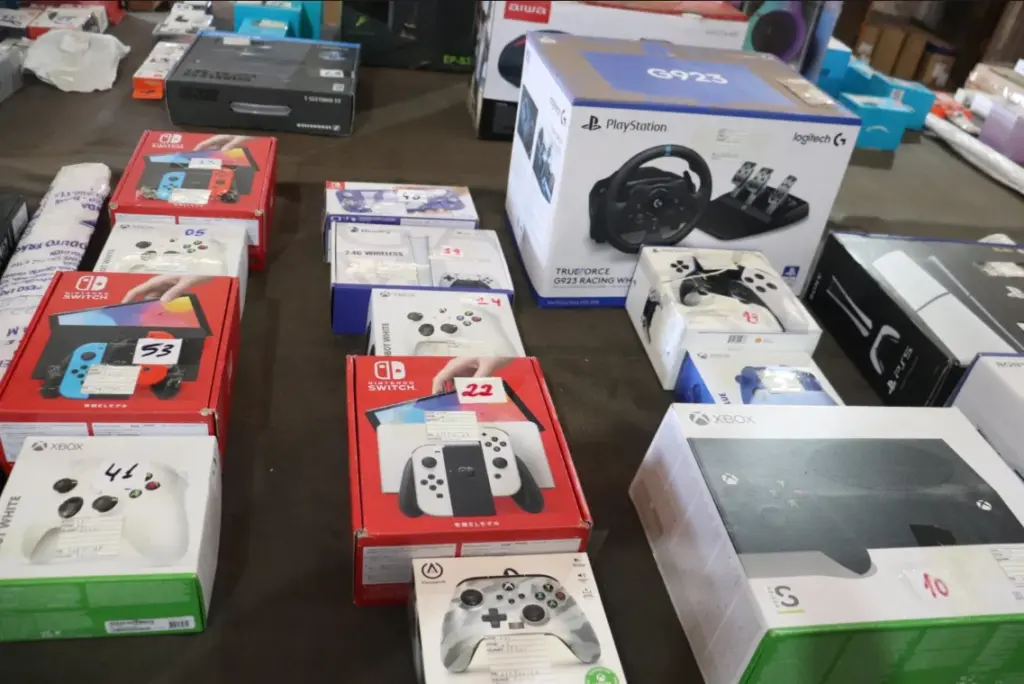 O lote inclui 2 unidades de PlayStation 5 de 1TB, 1 PlayStation 5 de 825GB, 6 consoles Nintendo Switch, além de 4 unidades de Xbox Series S (512GB) e 6 unidades de Xbox 512GB modelo 1883.