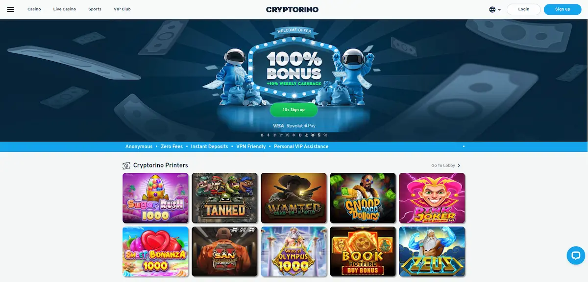 Zero-KYC реєстрація вимагає лише email – документи потрібні тільки при великих виплатах. Платформа підтримує Bitcoin, Ethereum, Litecoin, Tether, Dogecoin, XRP, а також Visa, Mastercard, Apple Pay та Google Pay. Виведення криптовалюти зазвичай проходить протягом 10 хвилин.
