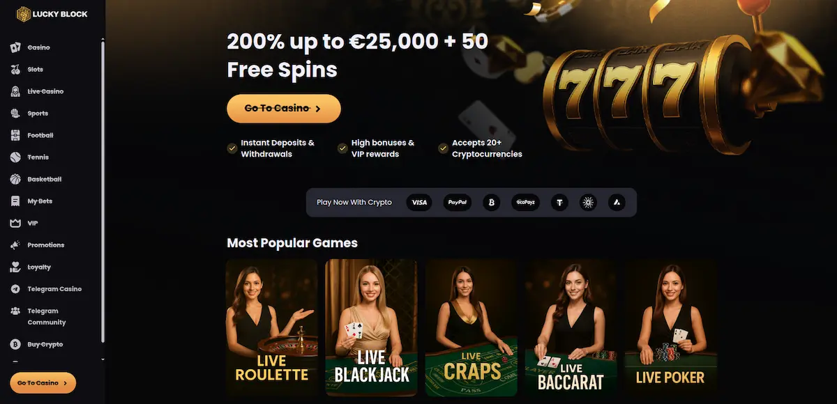 У Lucky Block вітальний бонус 200% до €25,000 + 50 фріспінів на Wanted Dead or a Wild відкривається поступово: кожні 6x ставки від депозиту вивільняють 10% бонусу. Мінімальний депозит €20 або еквівалент у криптовалюті дає доступ до 4000+ ігор від Pragmatic Play, Evolution Gaming, Microgaming, Play’n GO, NetEnt та Ezugi.