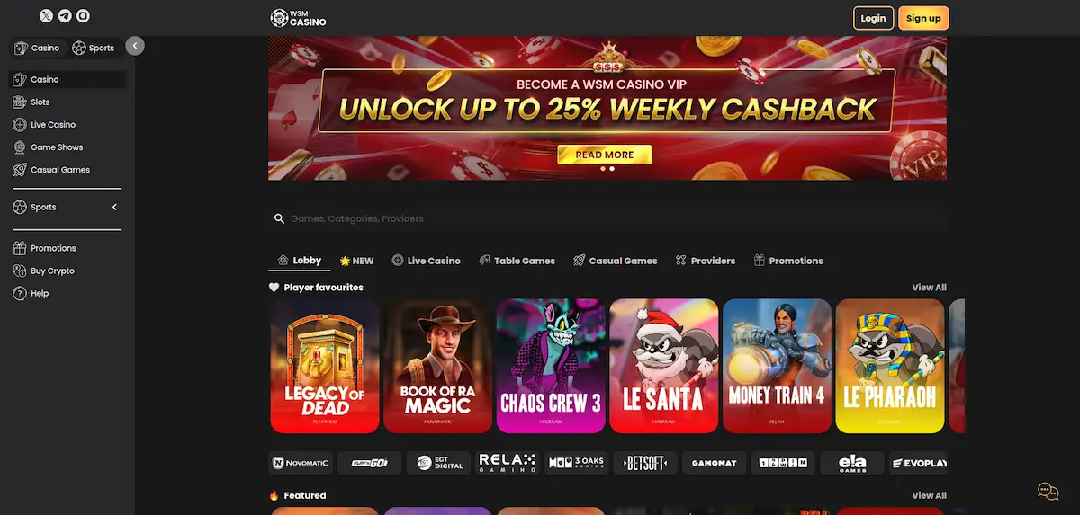 WSM Casino приймає Visa/Mastercard, PayPal, банківські перекази та криптовалюту. Виведення криптовалюти та електронних гаманців проходить миттєво, картки та банківські перекази займають 1-5 днів. Верифікація KYC потрібна при виведенні коштів.